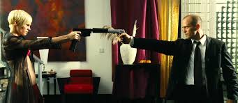 In this image we can see that both the characters are at gun point. It is highly possible that they both hate each other due to their aggressive facial expressions as well as their guns. Jason Statham (left) is standing with one gun in his hand as opposed to Kate Nauta who stands with two. This suggests that the man in the suit is a 'bad-ass' character who doesn't need as much power as his enemies to come out of a fight alive and will square up to a challenge. The suit infers he takes his job seriously and is dapper. They seem the be in a luxurious house because of the decoration and vases in the background. Also, the vibrant colours could suggest this.The audience would expect this because they understand the type of people they are fighting but from this image the audience could infer that the villain has a partner in crime with money. The mood in the scene could be an intense one because of the guns.